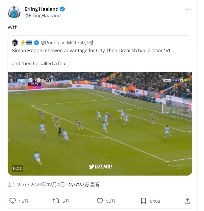 恐怖关注度哈兰德WTF喷判罚推文评论超1.5万,点击近3000万 12月4日讯 曼城3-3战平热刺,裁判西蒙-胡珀吹停曼城反击的判罚引起巨大争议。赛后哈兰德直接转发视频并发了句WTF开喷。这条推文引起了很大反响,截止发稿,数据... 2023-12-04 阅读全文